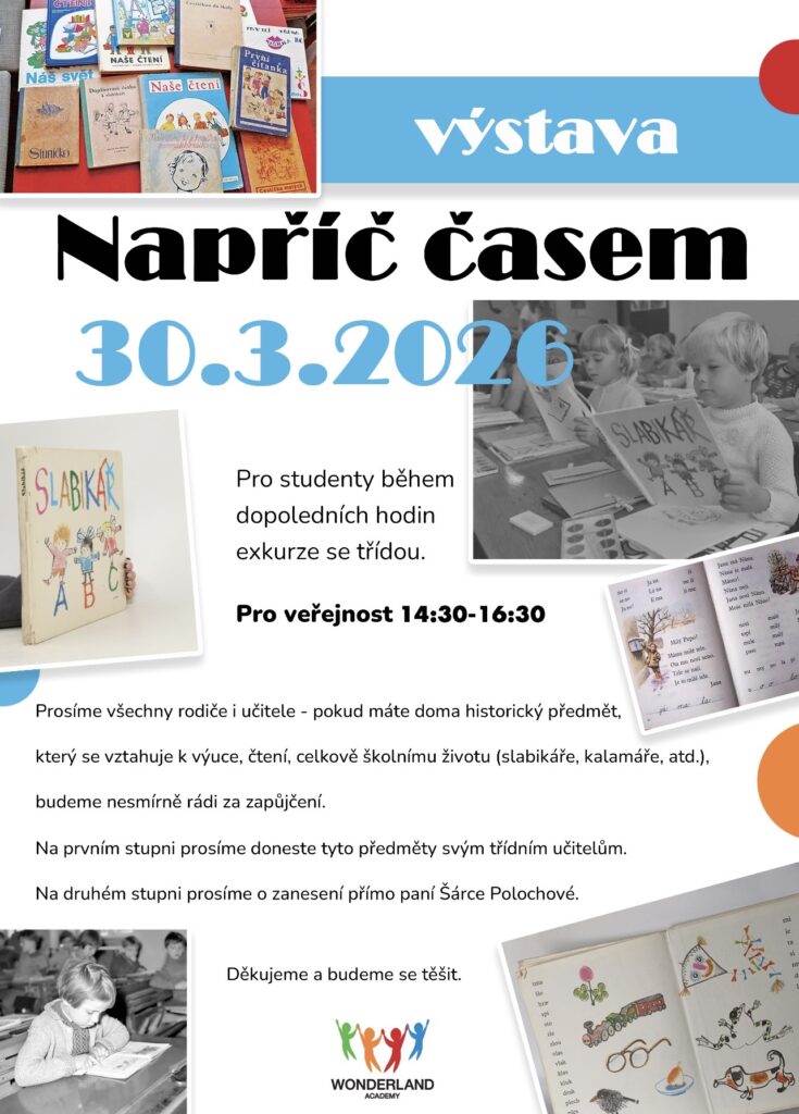 Zároveň prosíme rodiče, jestli mají doma nebo u svých příbuzných jakékoliv starší předměty (ideálně ty, co se vážou ke škole), jestli by je na výstavu zapůjčili. Předměty na výstavu mohou nosit na prvním stupni přímo učitelům, na druhém stupni paní Šárce Polochové. A to do 27.3.2026.