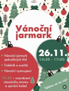 Srdečně Vás zveme na vánoční jarmark, kde děti budou prodávat své výrobky. Společně si také zazpíváme vánoční písně a rozsvítíme vánoční strom. Těšíme se na